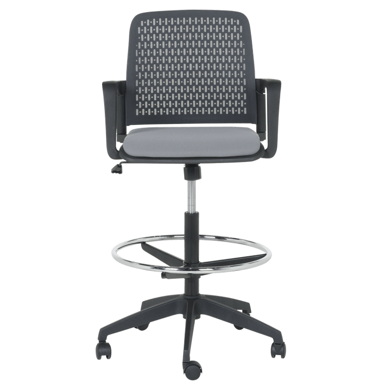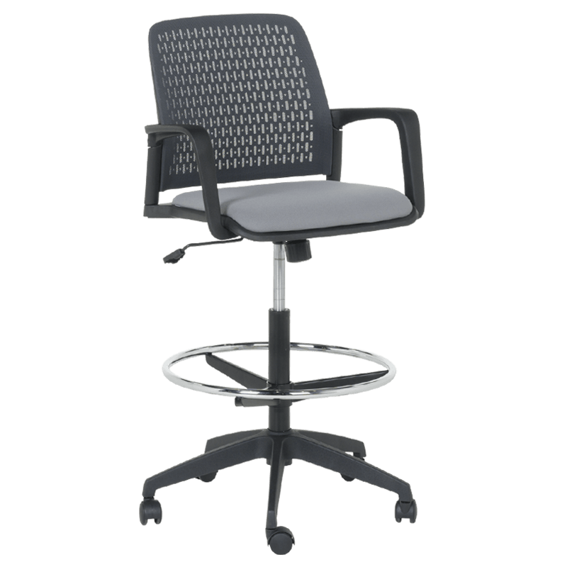 Работен офис стол 7556 комбинира функционалност и комфорт. Благодарение на регулируемата си височина и хромирана степенка тип ринг, той може да се използва както като обикновен офис стол, така и като висок работен стол. Степенката осигурява удобна опора за краката и предпазва от неприятното усещане за „висящи“ крака при по-висока позиция на седалката. Седалката е тапицирана с дамаска, а облегалката е изработена от полипропилен с мрежеста структура за по-добра вентилация и циркулация на въздуха.