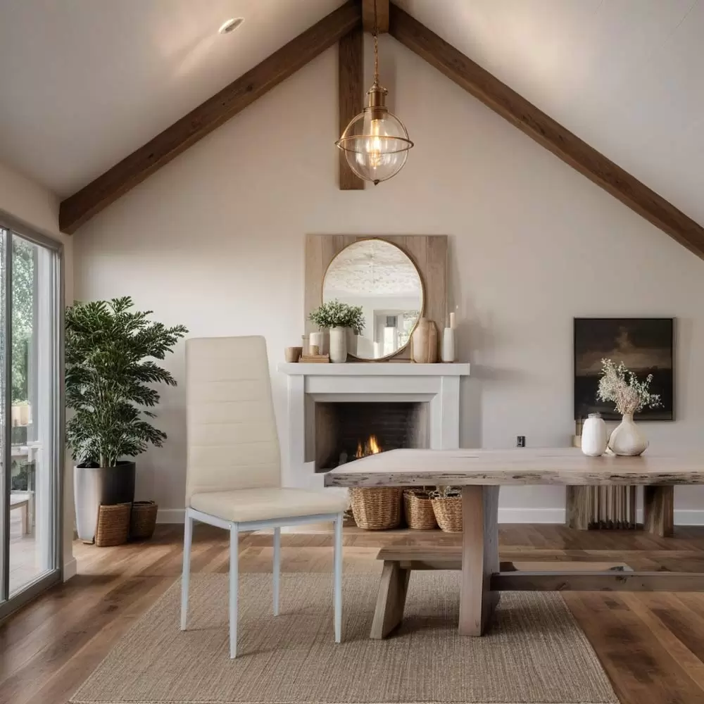 Минимално количество 4 броя. Кухненски стол с матирана метална основа, седалка и облегалка, тапицирани в еко кожа и набраздена форма. Стол HORHE допълва модерното обзавеждане в дома Ви.
