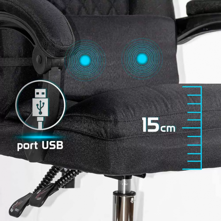 Един от най-интересните аспекти на този стол е двуточковата масажна лумбална възглавница , която помага за намаляване на напрежението, натрупано в долната част на гърба. Може лесно да се включва и изключва с бутон за включване/изключване и се свързва към USB , като ви осигурява персонализиран комфорт дори по време на продължителна работа.
