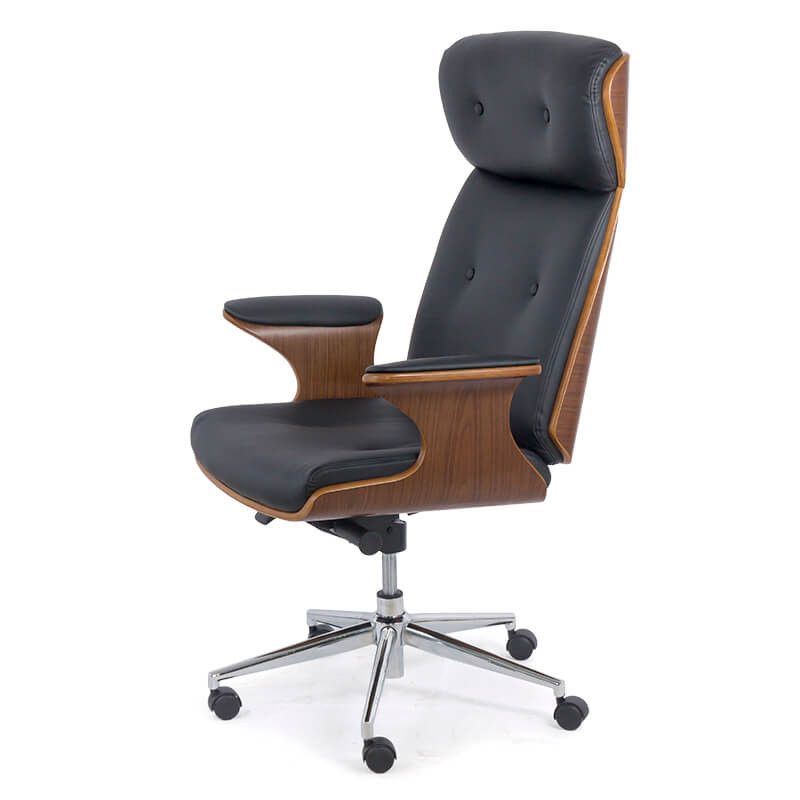 Снабден е с елегантни извити подлакътници от дърво с еко кожа, хромирана стоманена основа и колелца за пълна мобилност.
