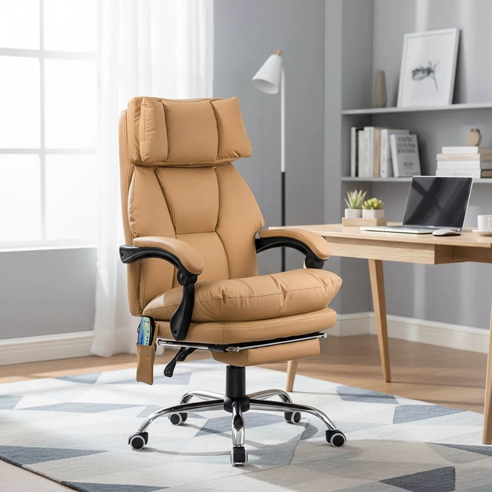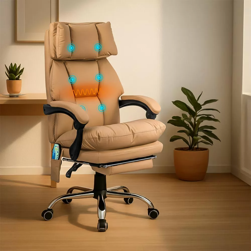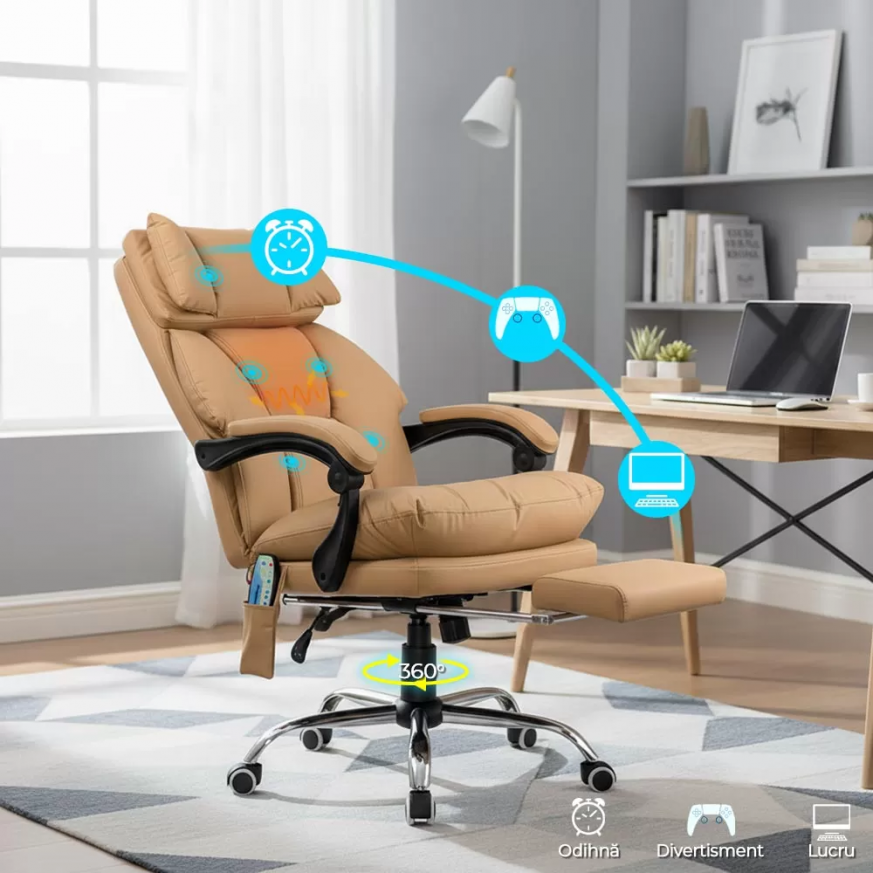 Ако искате стол, който съчетава елегантност, комфорт и функционалност, моделът Delfon е идеалният избор. Специално проектиран за модерни офиси и комфортни работни пространства, този стол предлага пълноценно релаксиращо изживяване благодарение на вградената масажна система и прибиращата се поставка за крака. Бежовата еко кожа добавя изискан вид, а плътната пяна отвътре осигурява отлична опора за гърба и раменете дори след часове употреба.