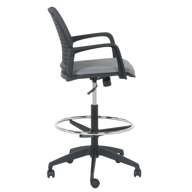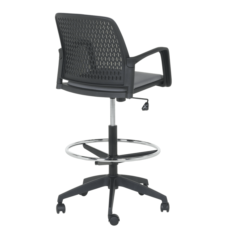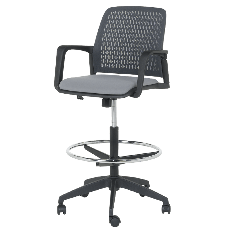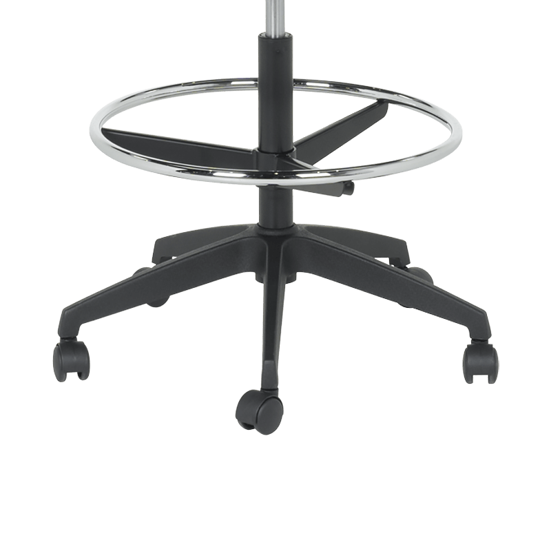 Работен офис стол 7556 комбинира функционалност и комфорт. Благодарение на регулируемата си височина и хромирана степенка тип ринг, той може да се използва както като обикновен офис стол, така и като висок работен стол. Степенката осигурява удобна опора за краката и предпазва от неприятното усещане за „висящи“ крака при по-висока позиция на седалката. Седалката е тапицирана с дамаска, а облегалката е изработена от полипропилен с мрежеста структура за по-добра вентилация и циркулация на въздуха.