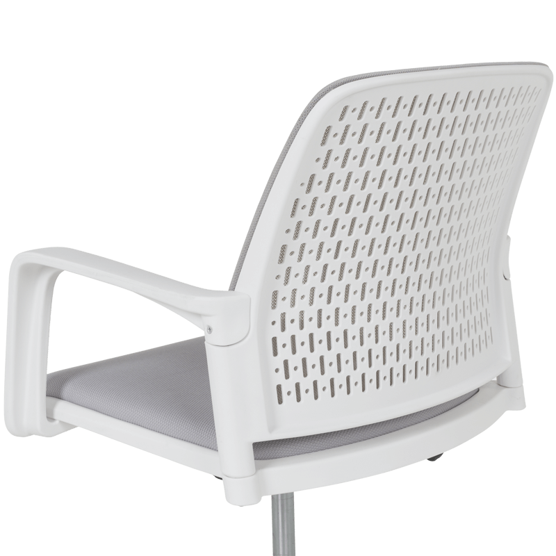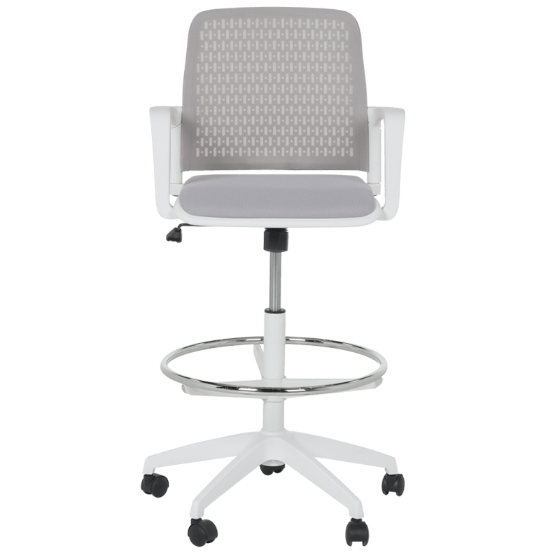 Работен офис стол 7556 комбинира функционалност и комфорт. Благодарение на регулируемата си височина и хромирана степенка тип ринг, той може да се използва както като обикновен офис стол, така и като висок работен стол. Степенката осигурява удобна опора за краката и предпазва от неприятното усещане за „висящи“ крака при по-висока позиция на седалката. Седалката е тапицирана с дамаска, а облегалката е изработена от полипропилен с мрежеста структура за по-добра вентилация и циркулация на въздуха.